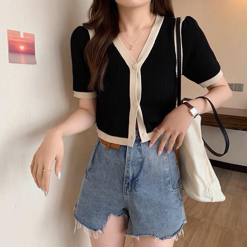 Áo cardigan croptop cổ tim viền màu phối nút chất len dệt kim co giãn thời trang dễ thương phong cách ulzzang 210010025