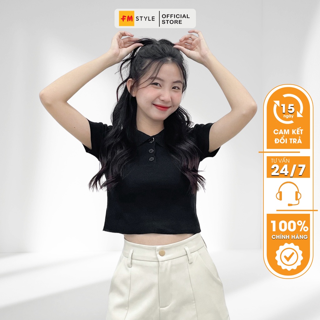 Áo croptop nữ FM Style tay ngắn cổ bẻ phối 3 nút chất len mềm mại phong cách thời trang Hàn Quốc 206090048