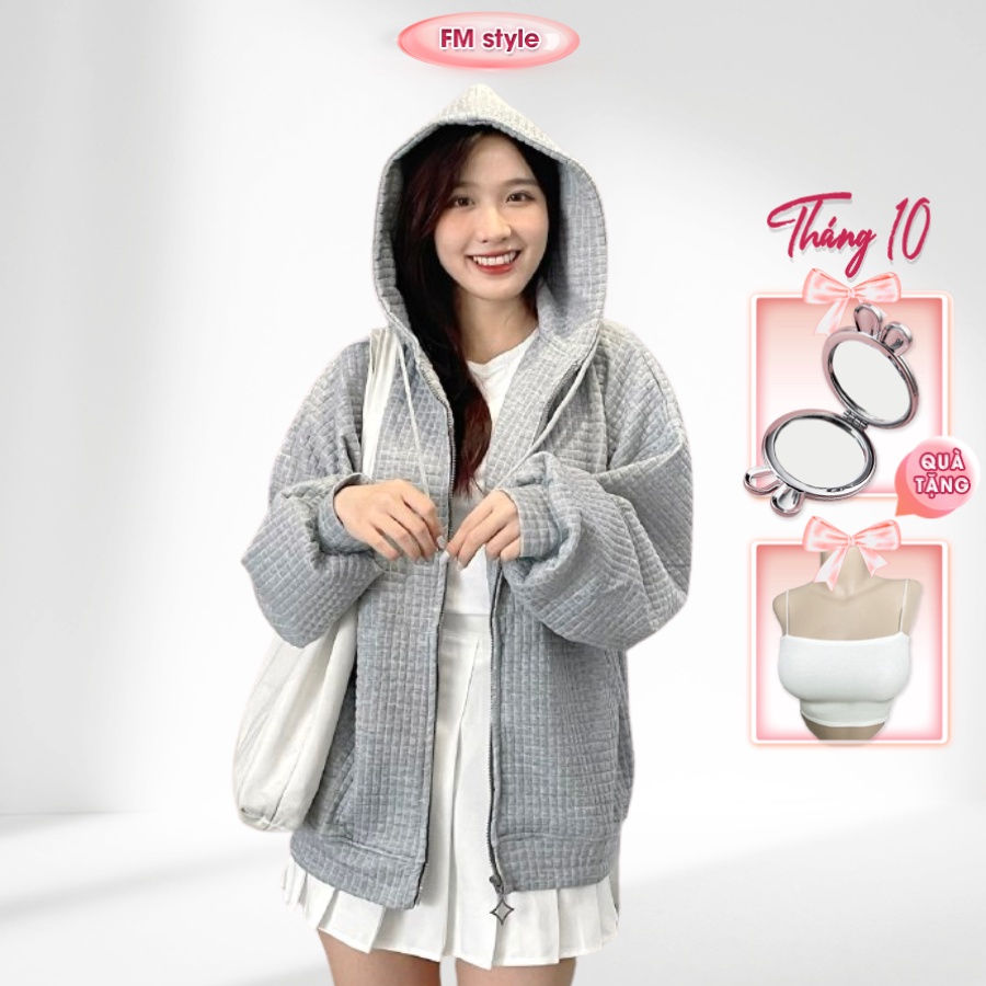 Áo khoác nỉ FM Style form rộng tay bồng basic khoá kéo phối 2 túi có mũ lớn thời trang ulzzang 208250011