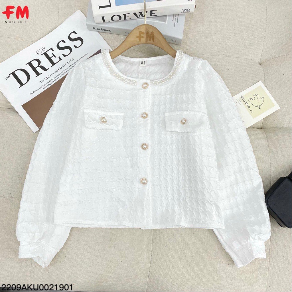 Áo kiểu nữ FM Style cổ tim tay dài phồng 2 túi nắp phối viền ngọc thời trang bánh bèo Hàn Quốc 209190032
