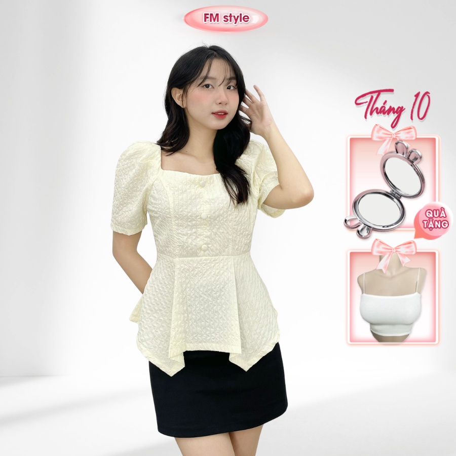 Áo kiểu nữ FM Style cổ vuông đính nút bọc thiết kế tà nhọn dập ly thời trang sang chảnh phong cách Hàn Quốc 209080083