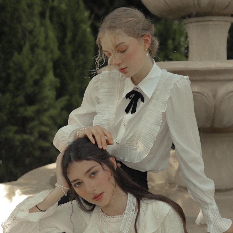 Áo sơmi bèo dài tay xếp ly phía trước có nơ nhung đen – Rosie Shirt