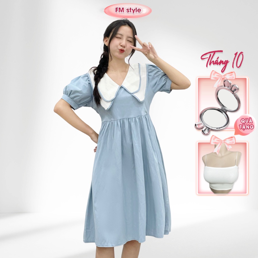 – Tên sản phẩm: Đầm nữ FM Style dáng babydoll phối cổ sen 2 lớp viền màu tay bồng thời trang bánh bèo phong cách Hàn Quốc