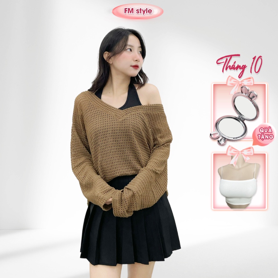 Set áo kiểu nữ FM Style vải lưới cổ tim tay dài kèm áo ống choàng cổ thời trang phong cách Ulzzang 209130014
