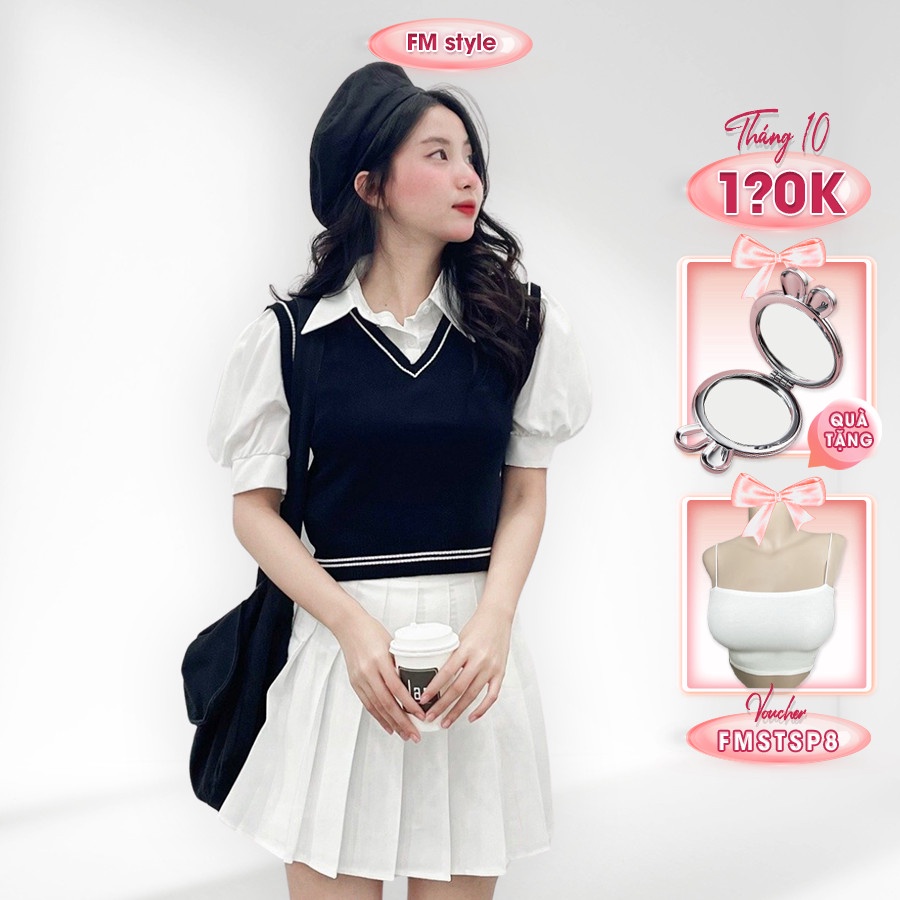 Set sơ mi phối gile FMSTYLE sơ mi cổ bẻ tay phồng phối gile chạy viền dày dặn phong cách ulzzang 206110067